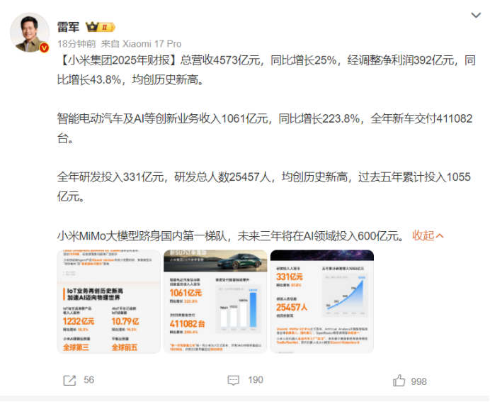 在汽车行业整体“增产不增利”、利润率跌至4.1%历史低位的背景下,小米交出了一份令市场侧目的成绩单,其智能电动汽车及AI等创新业务全年收入1061亿元,同比增长223.8%,增速远高于手机、智能家电等传统业务板块,成为集团最强增长点,且该板块首次实现年度经营收益转正达9亿元,去年整体毛利率24.3%,同比提升5.8个百分点。