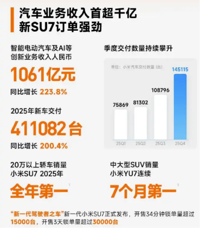 财报显示,2025年小米汽车季度交付数量持续攀升,其一季度交付75869台,二季度81302台,三季度108796台,四季度达到145115台。全年41.1万台的交付量,使小米稳居中国新势力车企第一阵营。