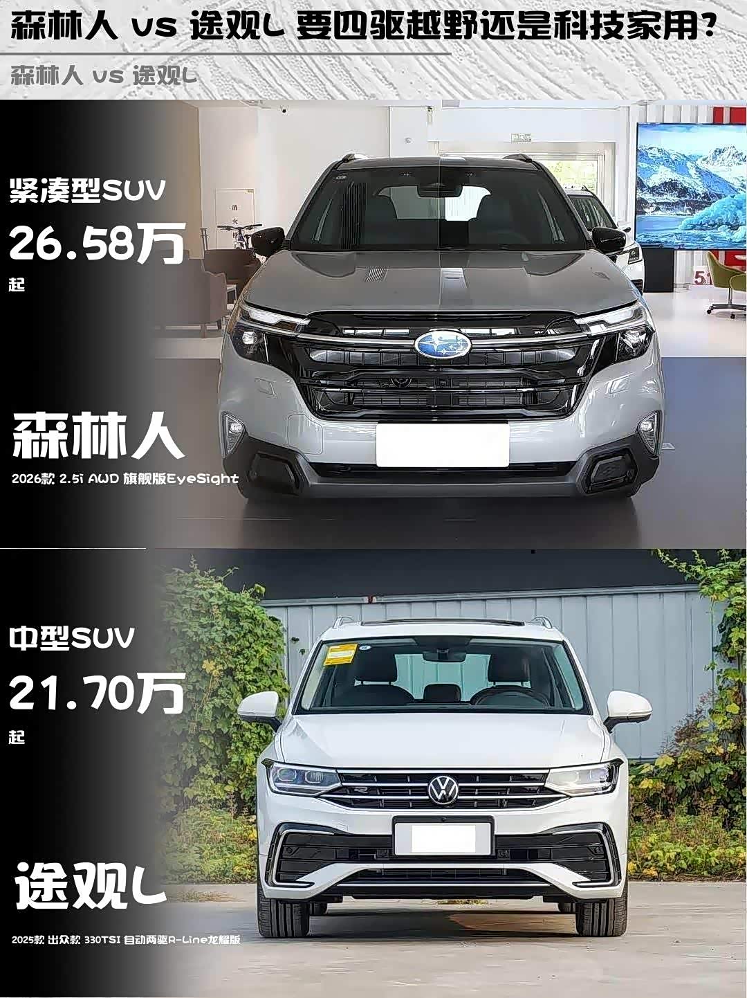 车家号·0浏览·2026-03-25 08:33 · 重庆最近在纠结选SUV的朋友看过来!今天深度对比两款热门车型—— 森林人(参数|询价) 2026款 2.5i AWD 旗舰版EyeSight和途观L 2025款 出众款 330TSI 自动两驱R-Line龙耀版,帮你找到最适合的那款!🚗💨