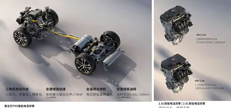 而2.5L HEV版油耗降低6.1%,百公里油耗低至4.91L,动力提升6.8%,最大功率达174kW。