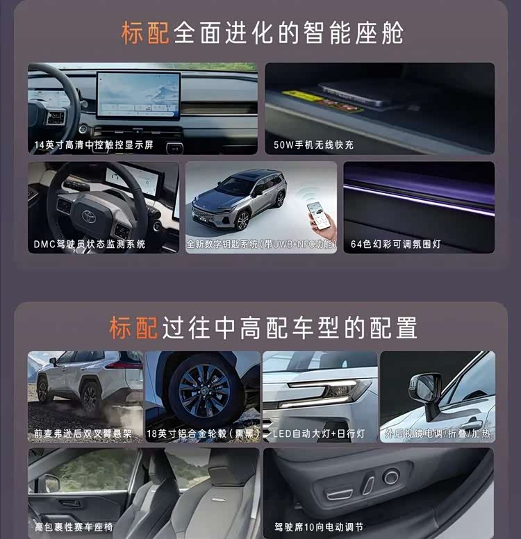 搭载丰田专为中国用户定制研发的最新一代数字化座舱平台,硬件层面采用8155P车规级芯片,确保车机系统流畅响应;配备15.6英寸中控屏(7.5mm窄边框)和新一代26.4英寸HUD平视显示系统。