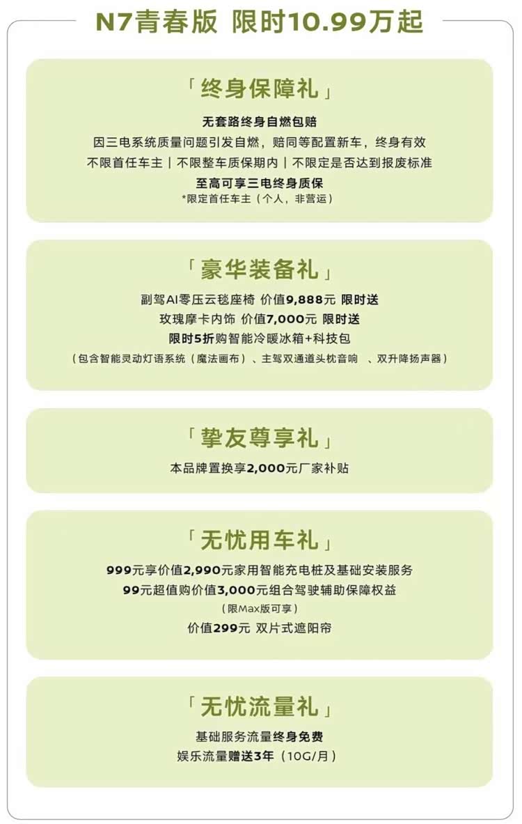 正所谓买车一时,用车一世,售后网点覆盖、质保政策、养护成本,也能够很好的决定长期用车幸福感。作为合资品牌,日产N7青春版享受东风日产“双终身”守护政策,首任车主三电终身质保+终身无套路自燃包赔,很好的消除电池衰减、安全隐患顾虑,而且日产全国拥有超千家线下服务网点,三四线城市、县城覆盖全面,保养、维修随到随修,不用长途奔波;保养成本低廉,基础保养单次仅200-300元,售后体系成熟,用车更放心。