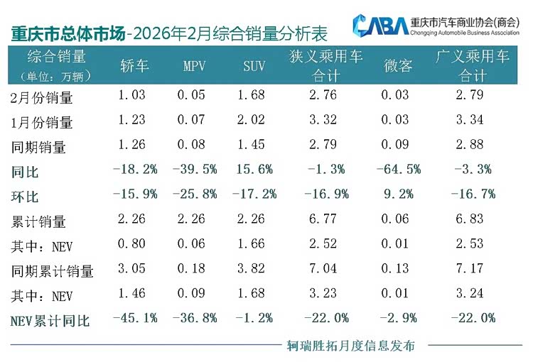 具体来看:2月份,重庆市场轿车销量1.03万辆,同比下滑18.2%,环比下滑15.9%;SUV销量1.68万辆,同比增长15.6%,环比下滑17.2%;MPV销量为0.05万辆,同比下滑39.5%,环比下滑25.8%。