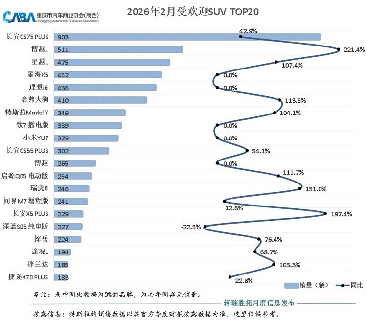 2月受欢迎SUV TOP20中,长安CS75 PLUS以903辆销量继续位居第一,其次是博越L销量511辆,星越L销量475辆。而上月位居第二的小米YU7,2月份则下滑到第九。