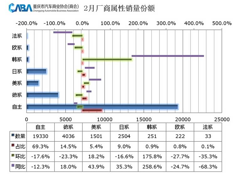 2月份,除了自主品牌销量同比回落,德系、美系、日系、韩系均出现同比正增长。尤其是美系、韩系品牌同、环比双增长,成为2月重庆市场一大亮点。