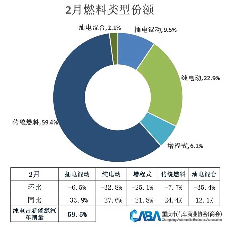 从2月销售车型的燃料类型来看,燃油车销量占比为61.5%(传统燃料59.4%+油电混合2.1%)。新能源汽车销量占比达到38.5%,其中纯电车型在新能源销量中占比达59.5%。从2月份燃料类型份额中能明显感受到春节车市特征,即:选购燃油车的消费者增多。