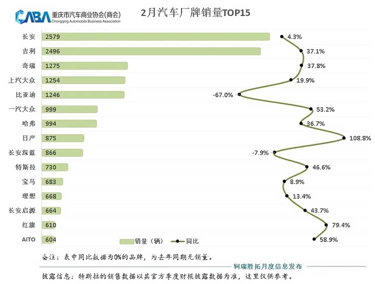 2月份,重庆市场厂牌整体呈现正增长状态,其中一汽大众同比增长53.2%、哈弗增长36.7%、日产增长108.8%、特斯拉增长46.6%、长安启源增长43.7%、红旗增长79.4%、AITO增长58.9%。