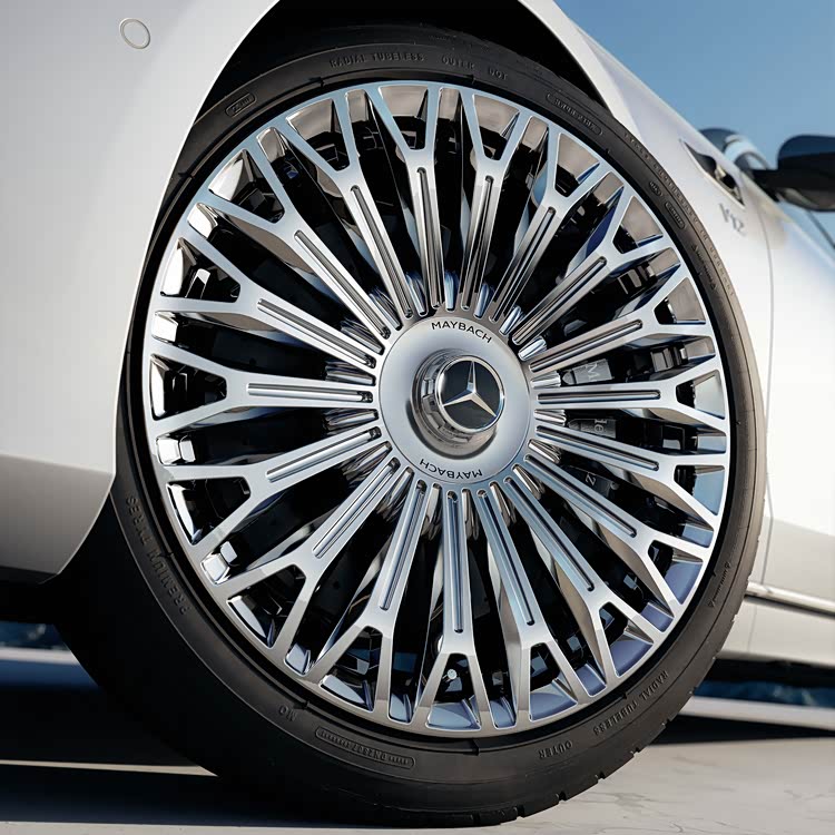 细节上,新车引入“双星徽”前大灯与玫瑰金装饰,配合进气口内密集排列的迈巴赫徽标元素,形成类似奢侈品“老花”的视觉语言。侧面设计同样强调仪式感:迎宾踏板可投射“MAYBACH”字样、悬浮式轮毂中心标始终保持正立、新增21英寸金色MANUFAKTUR轮圈。