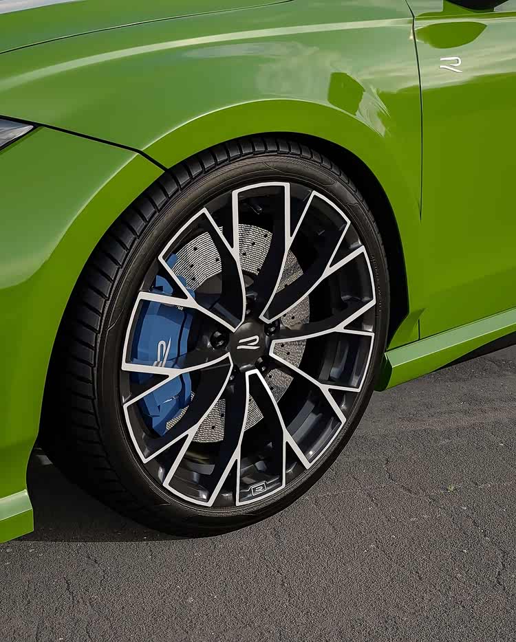 可以看到,该车还升级了尺寸更大的轻量化轮毂,并且搭配高性能制动卡钳以及刹车盘,从而提高驾控表现。