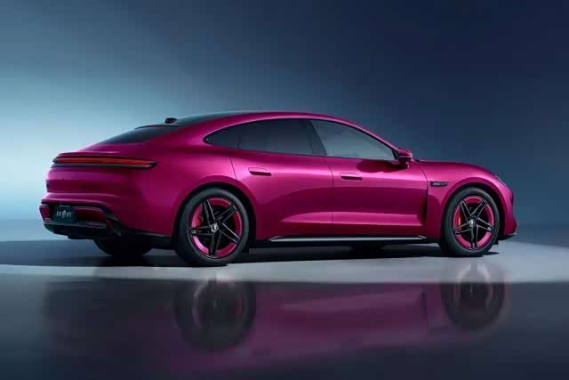 车身侧面动感流畅,车门为半隐藏式门把手。新车尺寸为4960*1985*1736mm,轴距为2950mm。轮毂有多种样式选择,内部还配有红色卡钳罩,进一步强化运动气息。车身提供活力橙、流光青、昼夜紫、钛空银、脉冲蓝、暖云白、曜石黑七种车身配色可选。
