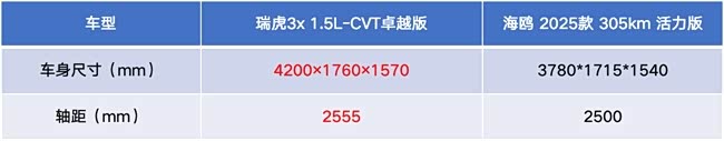 今天我们把目光放在两款热门小车上:奇瑞瑞虎3x 1.5L-CVT卓越版(以下简称瑞虎3x卓越版)和海鸥 2025款 305km 活力版(以下简称海鸥),从实际出游场景出发,看看谁才是春季出行最优选。