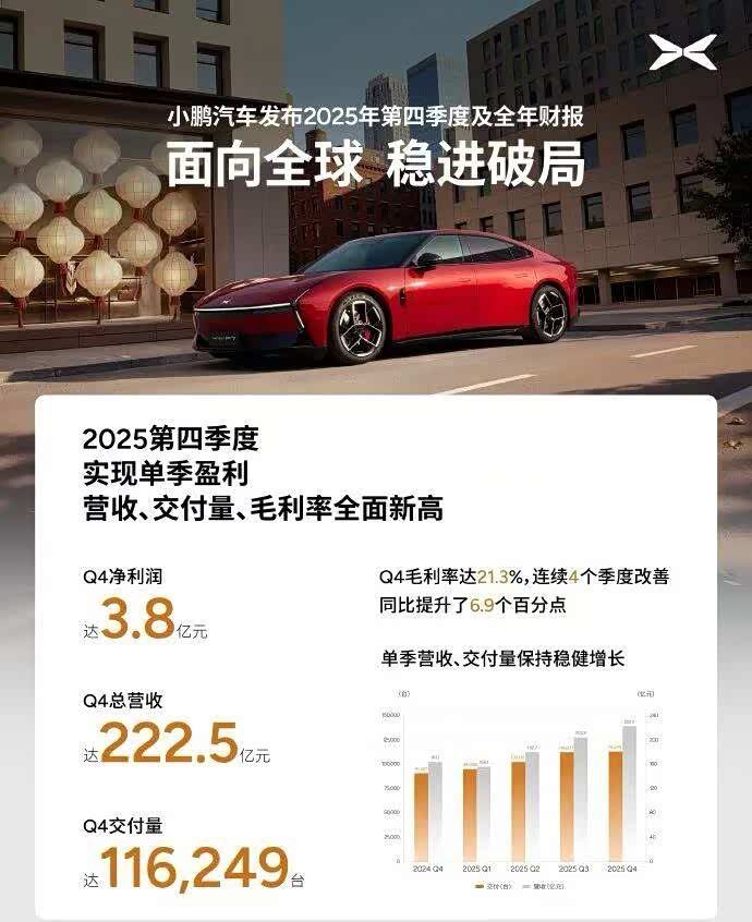 其次是利润,首次实现单季度盈利,2025年第四季度,小鹏汽车实现了净利润3.8亿元,这是公司自成立以来首次录得单季度盈利。要知道,2024年同期,这一数字还是亏损13.3亿元。从“亏血”到“造血”,这一跃升的意义不言而喻。