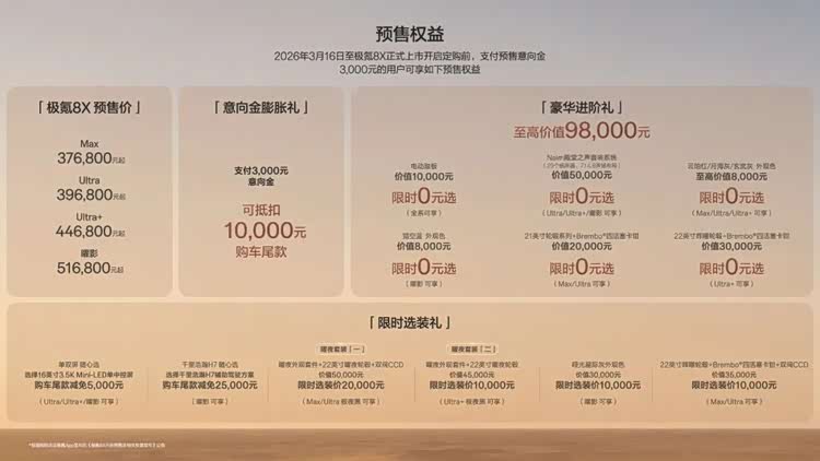 首先说价格本身,除去预售价51.68万元的极氪8X曜影,37.68万到44.68万的三款主力产品,价格区间基本和问界M8对标,考虑到最终上市价格通常会再降一些,以及预售减7000元的权益叠加、选装赠送,最终极氪8X的价格或许会拉低到35万元区间。