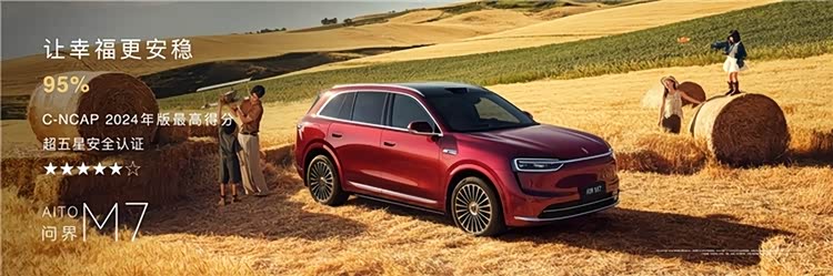 安全,是幸福的基石。问界M7在乘员舱核心区域采用100%热成型钢覆盖,构筑了坚不可摧的车身结构。同时,配备的鸿蒙ALPS健康座舱选用环保母婴级用料,为家人提供了全方位的安全与健康守护。正是凭借如此全面的主被动安全能力,问界M7近日在C-NCAP(2024版)测试中,以95%的综合得分率刷新历史纪录,一举摘得超五星安全评价,再次印证了其作为行业安全标杆的硬核实力。