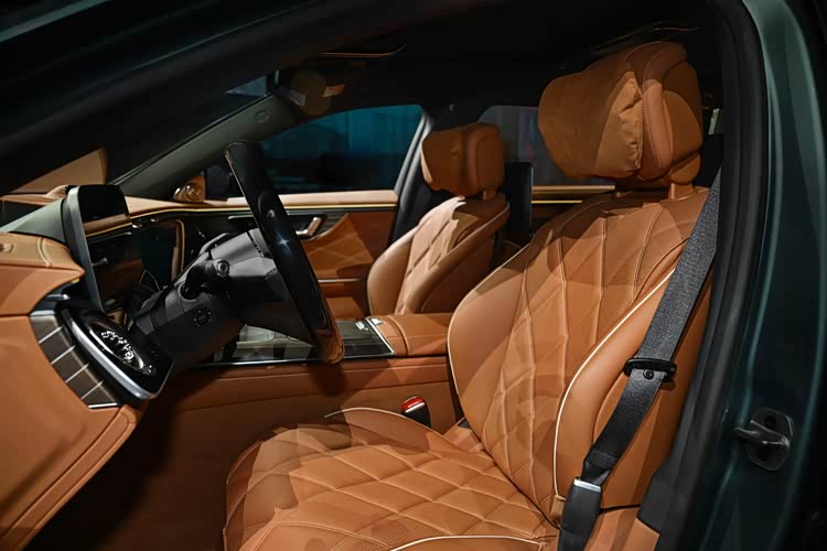 只是,假如你想要至臻豪华的双色车身,至少要从S580开始选择。迈巴赫经典双色车漆由工匠遵循最高标准手工喷涂而成,耗时一周才能完成一台——双色迈巴赫S级,是尊贵与品位的高阶表达。按照惯例,双色车身不会向S480的车型开放,以保证其特殊的尊崇地位。发布现场的两台车型分别为S580和S680,都采用了双色车漆,整体观感绝对要比单色的迈巴赫S具备足以匹配价差的情绪价值。