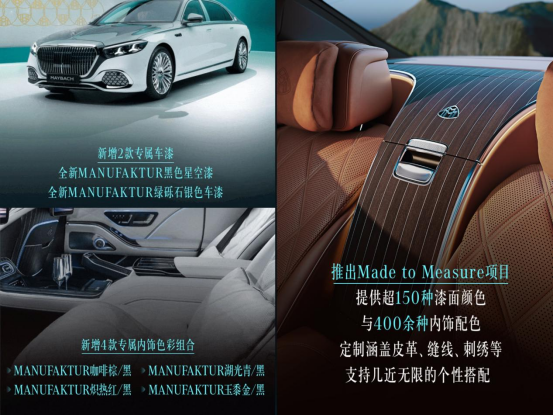 对于想要追求个性的老板们来说,这次的MANUFAKTUR至臻高定不仅新增了2款定制车漆和4款专属内饰色彩组合,还引入了全新的Made to Measure项目,支持更丰富的定制化选项,有超150种漆面颜色和400余种内饰颜色,涵盖皮革、缝线、刺绣等,专属感拉满。