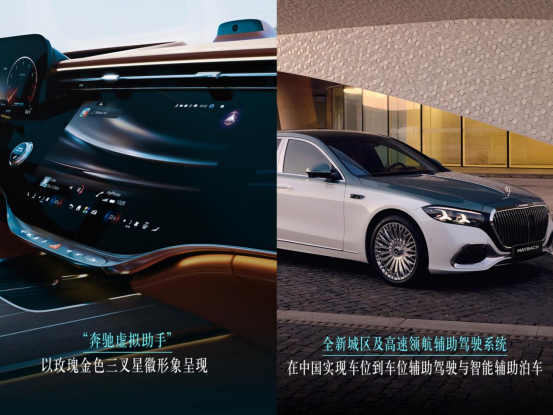 新款迈巴赫S级搭载奔驰最新的MB.OS架构,打通了座舱、辅助驾驶和性能三大域,智能化有很大升级。车机搭载奔驰最新的第四代MBUX交互系统,内置升级版的AI语音助手,并且在呼出的虚拟助手也是专属的玫瑰金色三叉星徽形象。而在辅助驾驶上,新款迈巴赫S级也采用了Momenta合作的全新城区及高速领航辅助驾驶系统,支持车位到车位的辅助驾驶以及多种智能泊车功能。