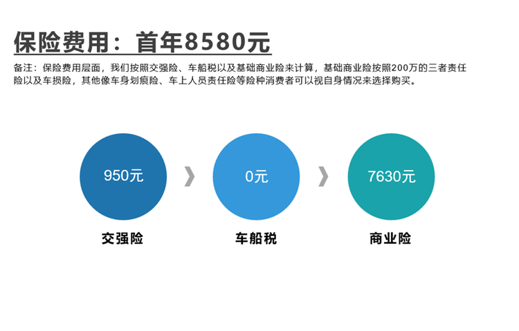 保险费用层面,我们主要计算交强险、车船税以及基础商业险这几个险种,其中基础商业险包含200万的三者责任险以及车损险,至于车身划痕险、车上人员责任险等额外险种,消费者可以视自身情况来选择购买。另外,此价格也不考虑之后几年不出险的折扣以及保险公司的优惠等。