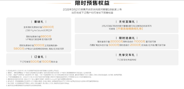 车家号·0浏览·2026-03-25 18:22 · 江西插混车型的纯电续航,一直是用户关注的核心指标之一。吉利银河星耀8远航家系列于2026年3月21日正式开启预售,预售指导价14.28万元至16.18万元。预售期间至上市当日完成下订的用户可享五大权益:重磅礼为全系限时免费享价值12800元23扬Flyme Sound无界之声,无忧至臻礼为3月21日前车主复购可使用千里浩瀚增换购礼券,限时选装礼为耀夜套装限时选装优惠,订金礼为500元抵1500元购车金,先享交车礼为下订即享优先提车权。