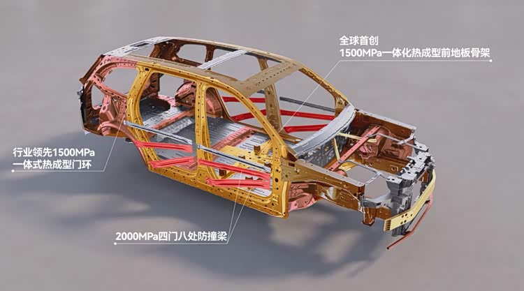 在车身材料及结构方面,华境S整车高强钢及铝合金占比超过85%,其中近30%为热成型超高强钢,为车身安全奠定了坚实基础。针对侧面撞击的薄弱环节,华境S采用了与宝钢共创的1500MPa一体式热成型前地板骨架,以及1500MPa一体式热成型门环搭配十宫格结构的挤压铝门槛加强梁,同时在四门八处增设2000MPa车门防撞梁,堪比潜艇用钢,大幅提升了车身侧面的抗冲击能力,让侧面防护坚不可摧。在此超高强钢材质和一体式结构基础上,华境S进一步采用五纵十一横六环笼式车身结构,使车辆无论是在承受高速撞击的单点暴力冲击,还是在不规则跌落翻滚中的多维扭曲力时,都能确保车身框架的完整性与电池包的安全。