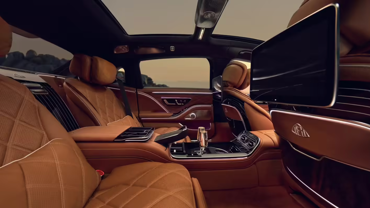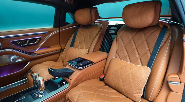座椅方面,四座版本体验最佳。中央通道电动开启后,放着德国Robbe & Berking定制镀银迈巴赫香槟杯,旁边是多瓶位车载冰箱。后排躺椅带按摩、加热、通风,脚托可伸缩,电动车门也是标配。