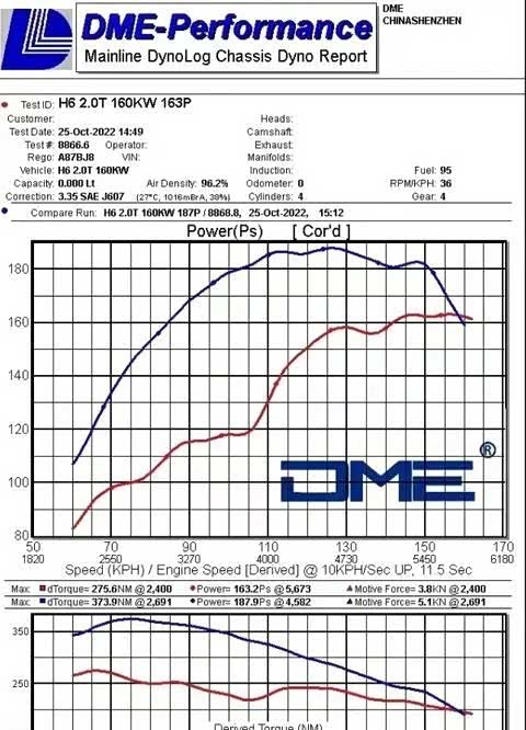 马力测试图显示,升级后的外挂电脑使轮上马力提升至188匹,扭矩增至373牛米。换算成发动机马力,则达到了260匹和522牛米,相较于原厂数据,分别提升了36匹和137牛米。从马力图上还可以看到,升级后的输出曲线更加平滑,这意味着驾驶体验将更加顺畅。综合来看,这款2.0T发动机的改装潜力确实令人瞩目。