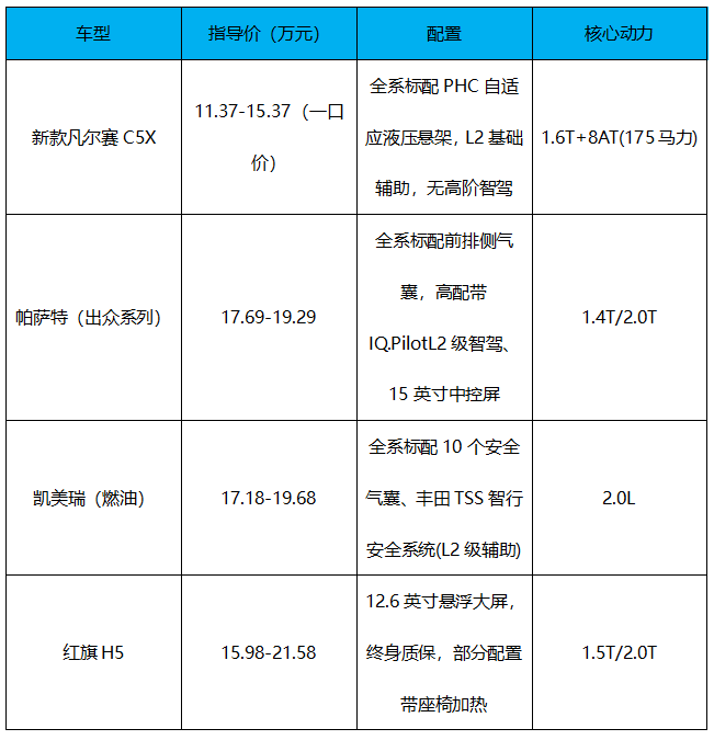 新款凡尔赛C5 X的主观销量预期无法足够积极,因为在其产品价格区间里,目前可以选择到的合资品牌中型轿车颇多,其中不乏热门品牌的畅销车;比如大众帕萨特、迈腾,丰田凯美瑞,本田雅阁,日产天籁等。
