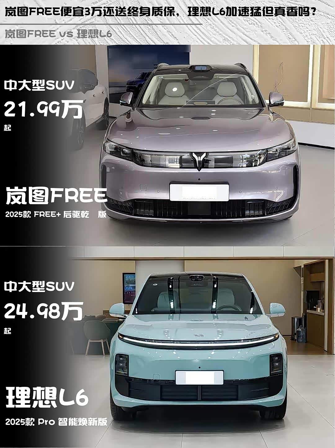 岚图21.99万比理想24.98万便宜3万!还送三电终身质保。理想有置换补贴,但维修成本略高。