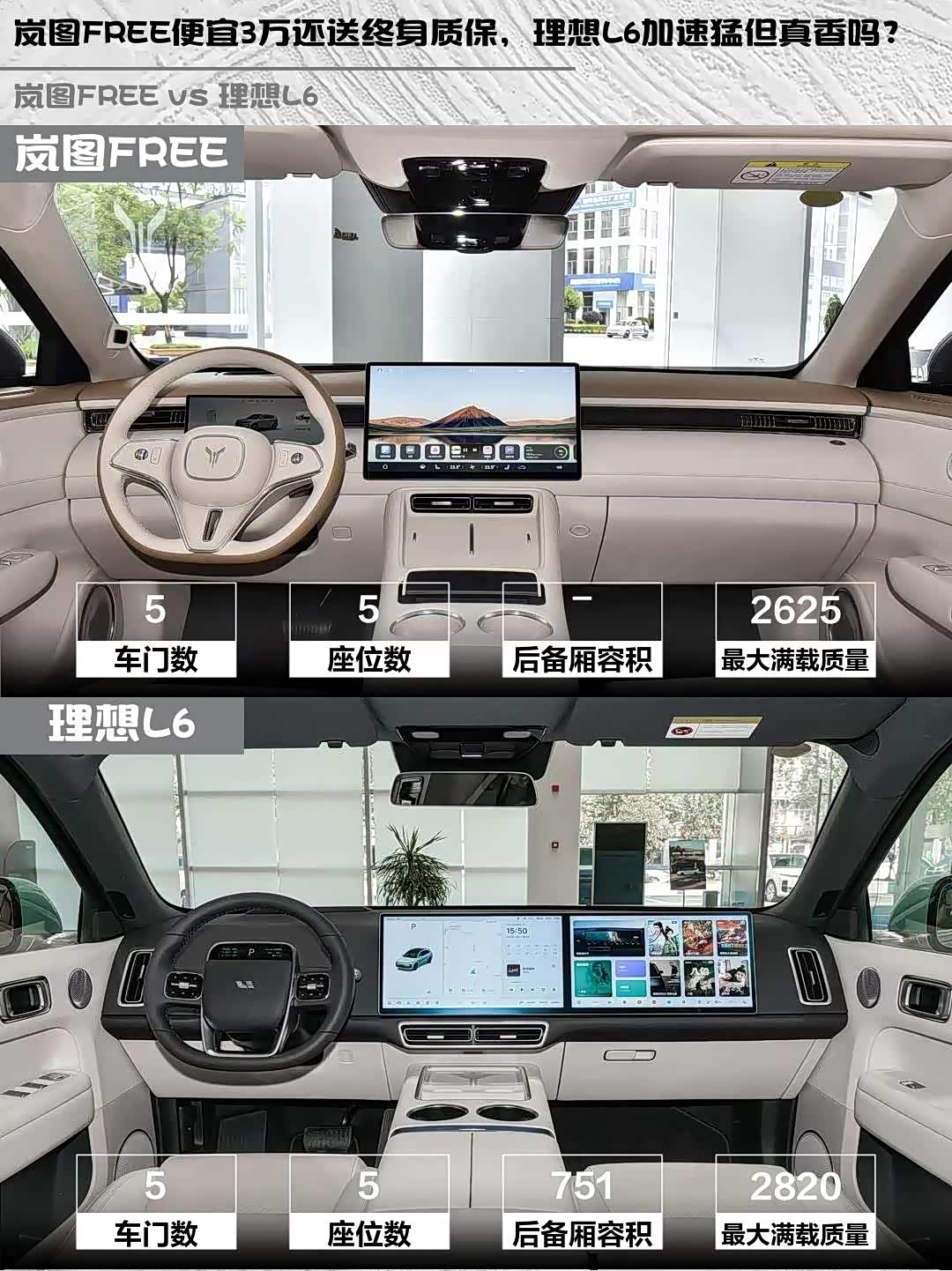 理想L6后备箱751L确实能装,后排纯平地台三人不挤。岚图FREE后排腿部空间更奢侈(2960mm轴距),590L后备箱+33处储物格设计更人性化,特别是7L冷暖冰箱夏天超实用!