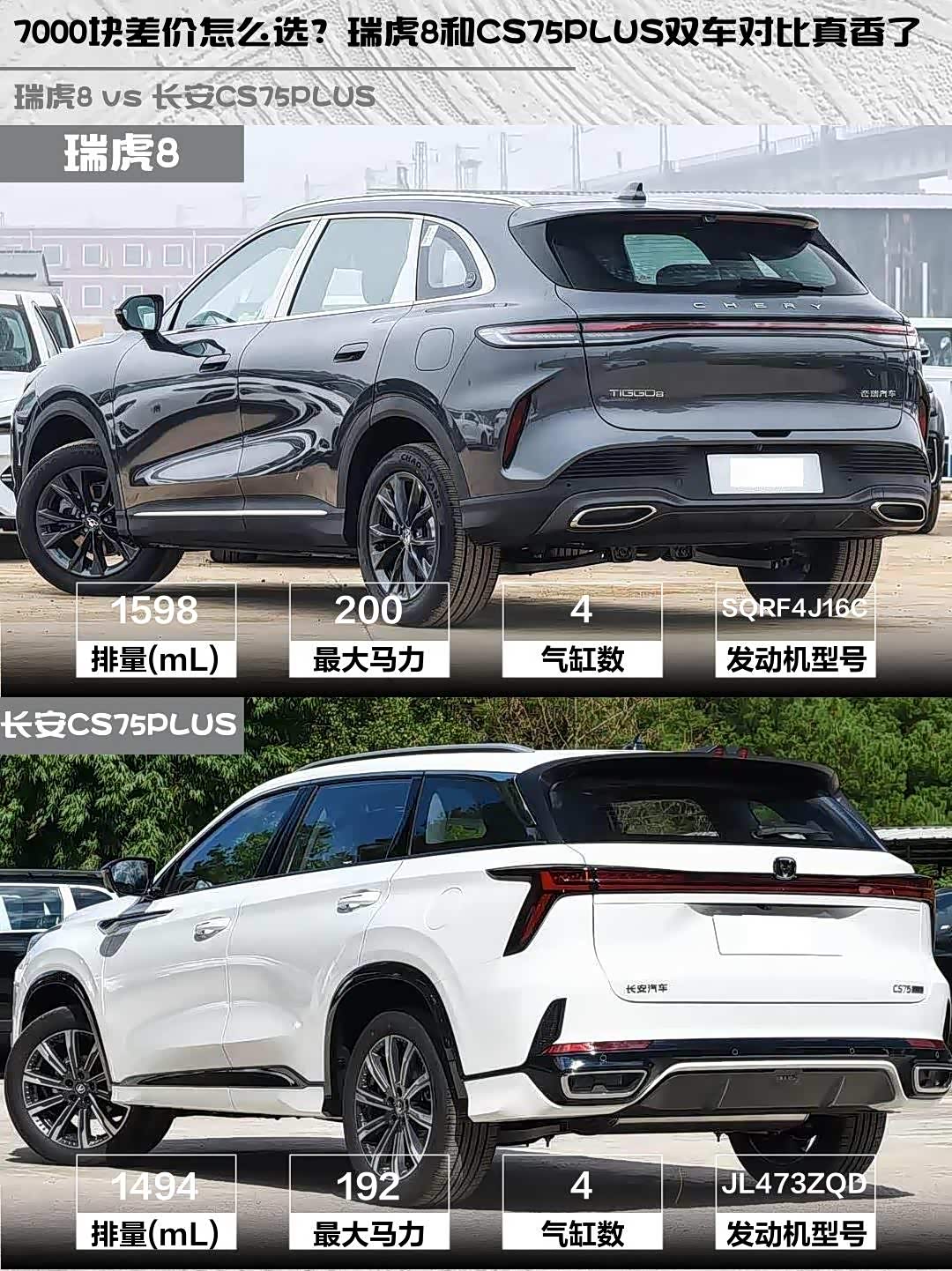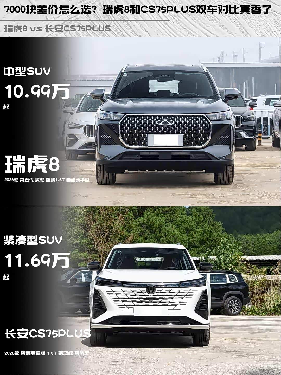 最近在选家用SUV的朋友看过来!今天深度对比两款热门车型——瑞虎8 2026款 第五代 虎款 鲲鹏1.6T 自动豪华型和 长安CS75PLUS(参数|询价) 2026款 智慧冠军版 1.5T 新蓝鲸 智航型,实测干货分享给你们~ 🚗