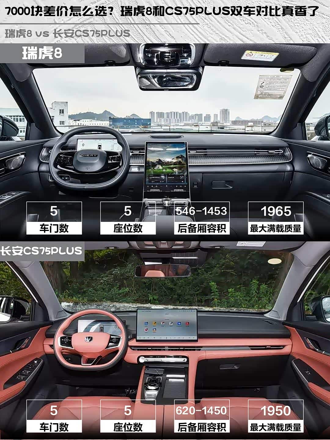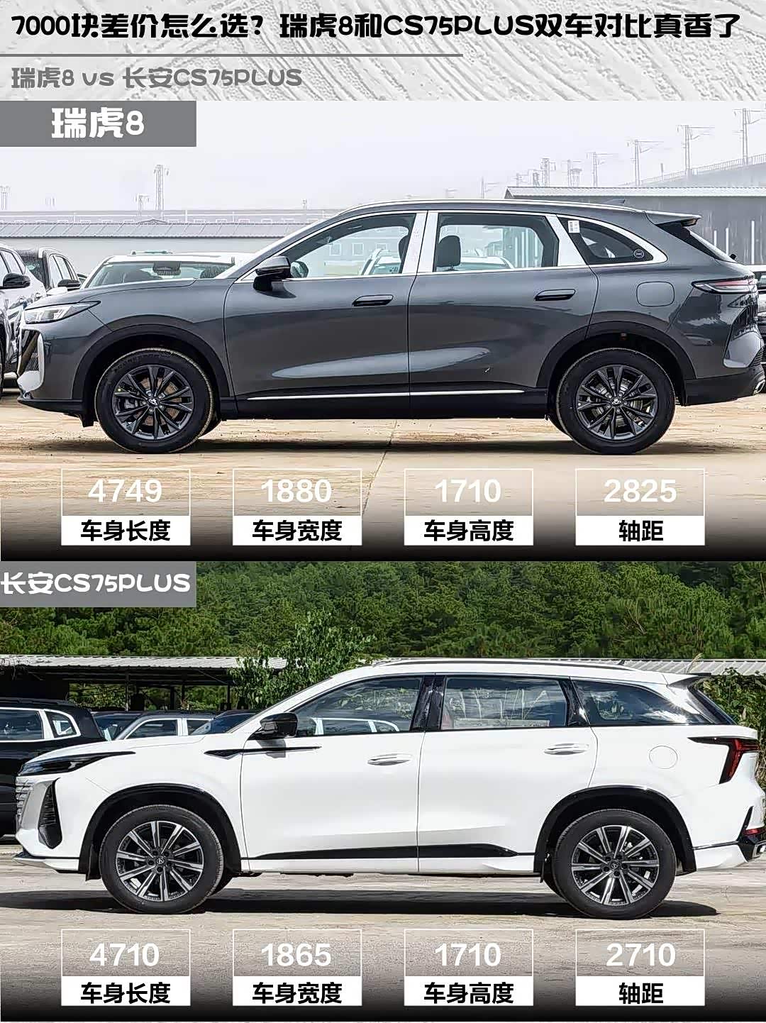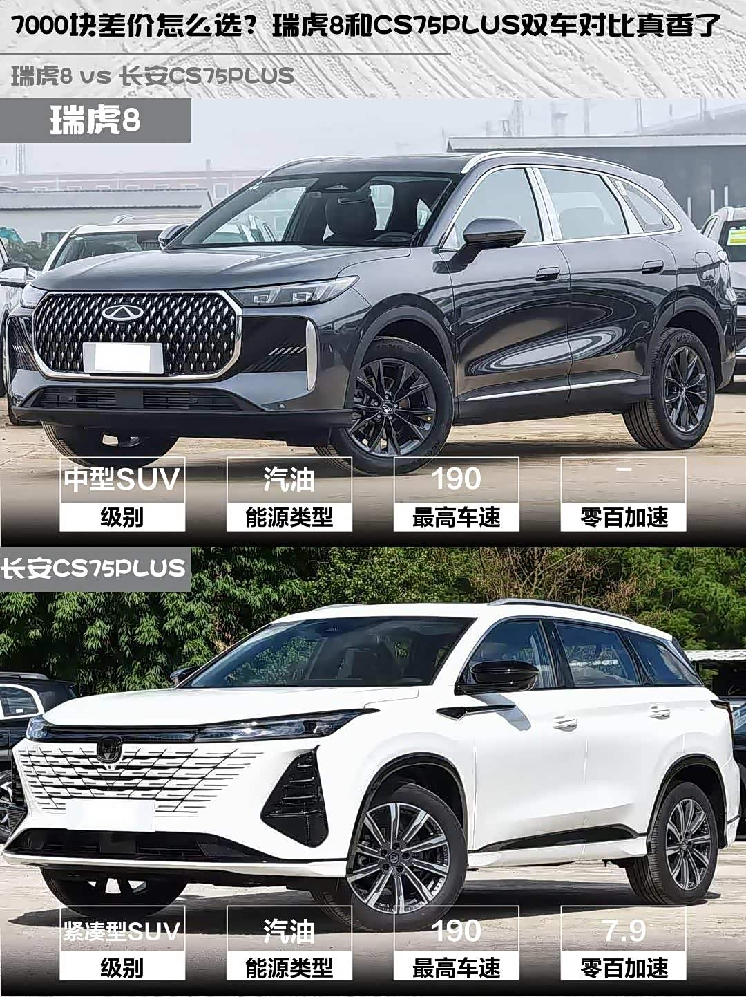 瑞虎8自动豪华型10.99万,CS75PLUS智航型11.69万,差价7000元。要空间大+配置全选瑞虎8,看重平顺性和豪华感选CS75PLUS。个人觉得瑞虎8性价比更高,但CS75PLUS的8AT变速箱确实香!