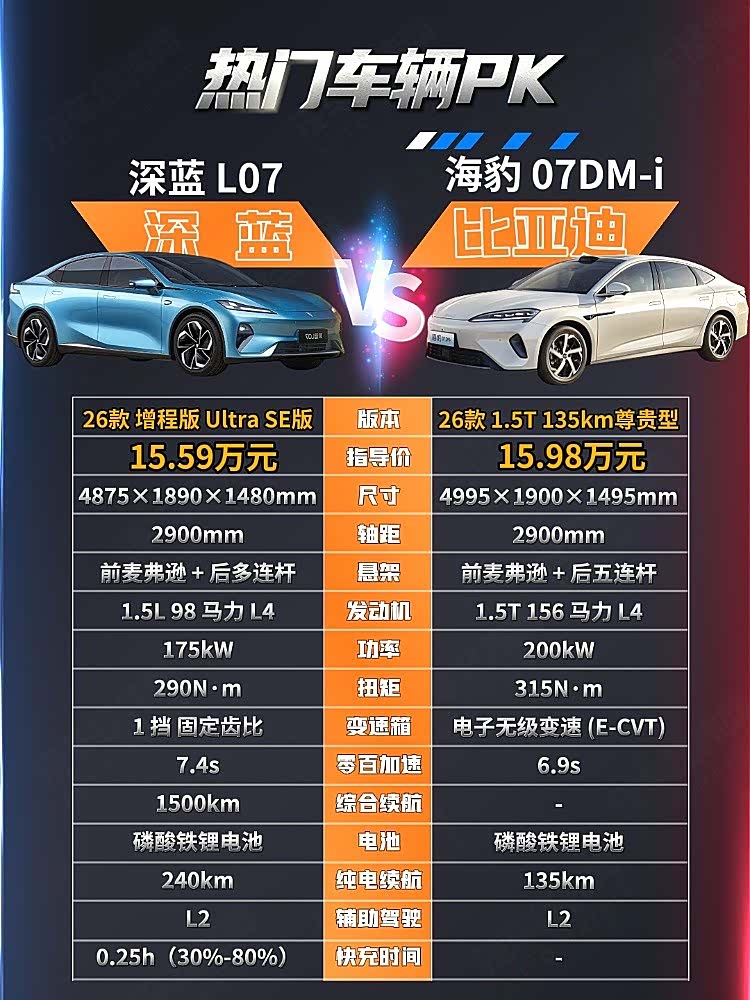 深蓝L07 2026款240Ultra华为乾崑ADS SE版售价为15.59万元,海豹07 DM-i 2026款1.5T 135km尊贵型售价为15.98万元,两者价格高度重合,分别给出了“科技平权”与“全面均衡”的不同解题思路,成为当下消费者在十五万元级区间难以绕开的选择,那么这两款车该怎么选呢?