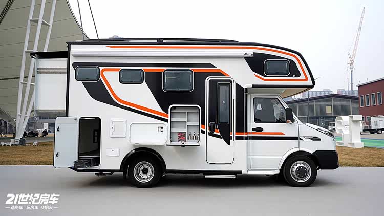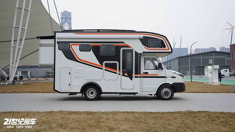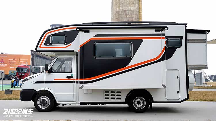 在外貌设计与户外配置上,这款房车做到了颜值与实用双在线,性价比尤为突出。车身采用黑色 + 橙色撞色的几何图案设计,视觉冲击力十足,行驶在路上回头率爆表,成为旅途中的独特风景线。