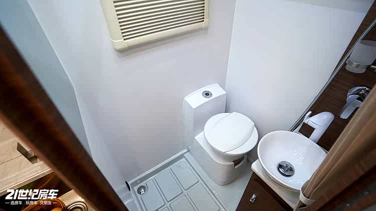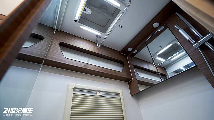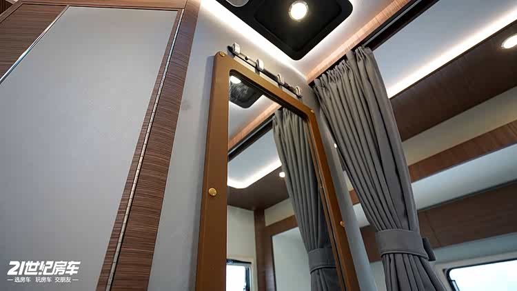 得益于双拓展设计,车内卫生间空间格外充足。卫生间内淋浴花洒、洗手盆、化妆镜柜、旋转马桶一应俱全,上方还设有换气扇,时刻保持内部空气流通;甚至贴心配备了全身镜,满足出行者的日常整理需求,细节处拉满旅居的幸福感。