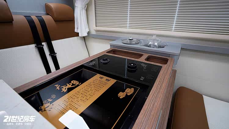 会客区的设计兼顾安全与体验,整车核载六人,适配家庭出行或好友结伴。区域采用双人对座的卡座沙发,配备四条安全带,出行安全有保障;卡座中部设有隐藏式茶台,闲暇时与家人朋友泡上一壶茶,畅谈休憩,氛围感十足。