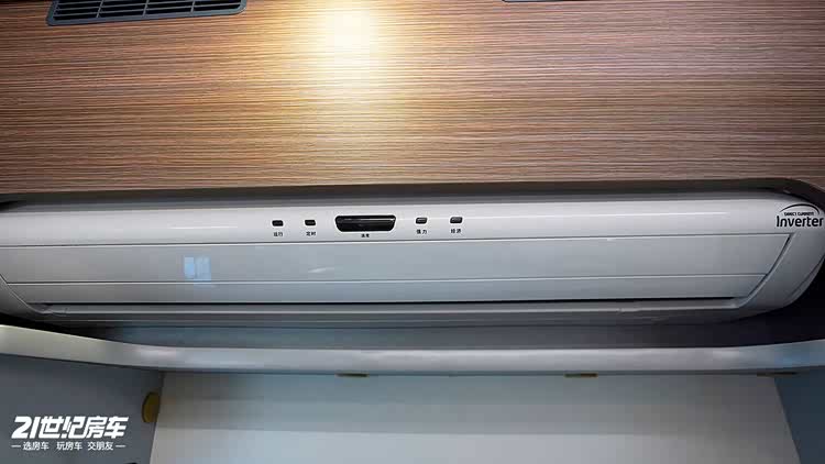 厨房区旁还配备了 7 公斤洗衣机,解决旅居途中的洗衣难题,上方则是 1.5 匹家用变频空调,随时为车内营造舒适的温度环境。
