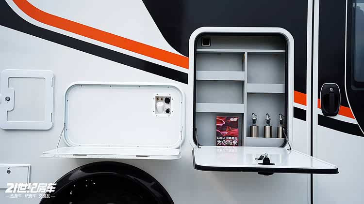 车身右侧专属打造户外露营与厨房一体化区域,配置丰富到面面俱到:上方配备 3.8 米户外遮阳棚,一键展开即可打造独立的户外休闲空间;桌板、调料架按需布置,满足户外烹饪的操作需求,尾部还设有外部抽拉柴油灶,让户外做饭变得专业又便捷。