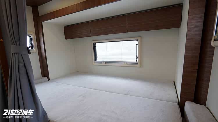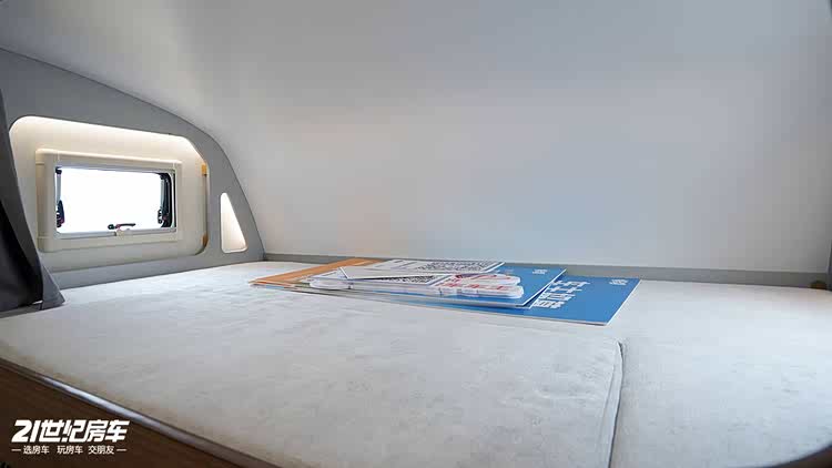 休息区域充分满足多人出行的睡眠需求,兼顾舒适与实用性。前方的鹅头床尺寸为长 2.19 米、宽 1.36 米,床高 80 公分,空间宽敞不局促,床板还采用上天式设计,内嵌 32 寸智能电视,躺在床上就能享受影音娱乐,旅居的惬意感拉满。