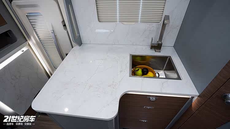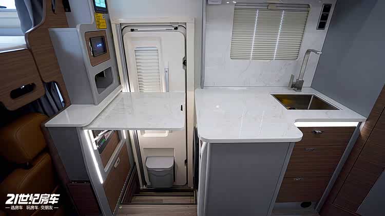 厨房区作为旅居生活的核心区域,配置更是堪比家用,彻底告别旅途烹饪的不便。台面采用仿大理石材质,耐脏易打理,日常清洁一擦即净;台面上洗菜池、电磁炉配齐,满足基本烹饪需求,上下方均规划了充足的储物空间,厨具、餐具可分类收纳;左侧还设置了拓展桌板,有效增加操作台面,让烹饪过程更顺畅。