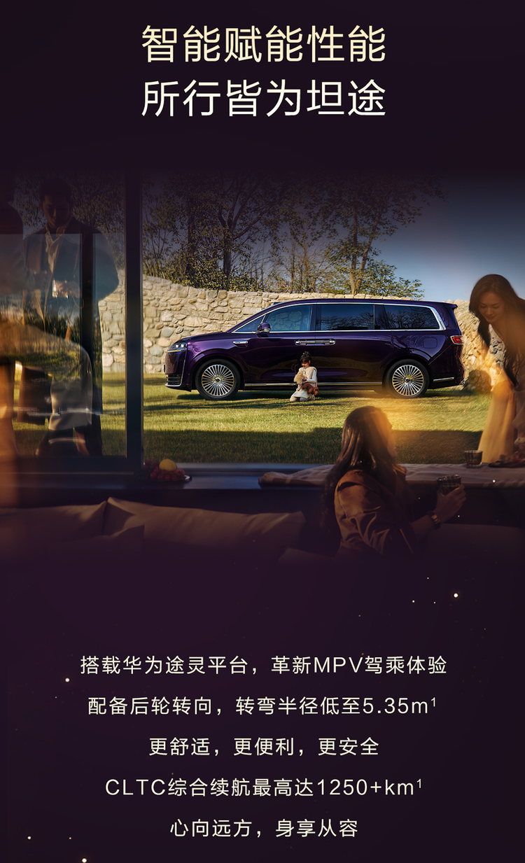 智界V9作为鸿蒙智行旗下MPV品类的补位之作,核心竞争力集中在“极致空间+华为全栈智能+超长续航+豪华健康座舱”多个维度: