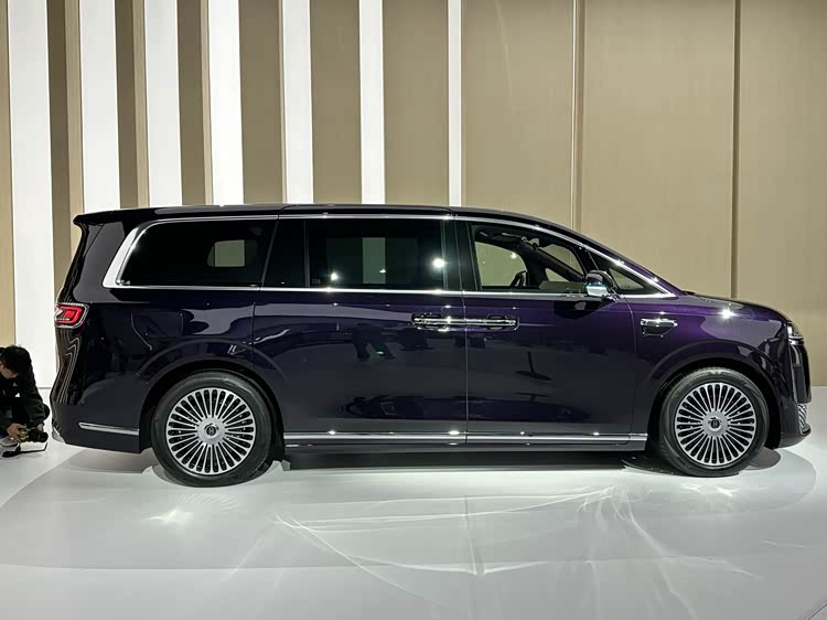 车身侧面线条平直舒展,配备电动侧滑门、外拉式镀铬门把手、多层隔音玻璃与隐私玻璃;车尾则饱满敦厚,贯穿式尾灯采用纳米级光导纤维+参数化矩阵灯珠,点亮后层次丰富。整体造型大气规整,不仅兼顾了商务范儿和家庭氛围,更营造出高端MPV的气质。