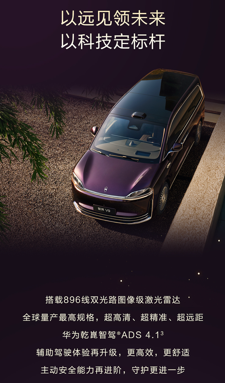 最后是智能驾驶,智界V9将搭载华为乾崑ADS 4高阶版,硬件包括896线双光路图像级激光雷达,支持车位到车位的全场景驾驶辅助,在复杂路况下感知更精准、安全更主动。