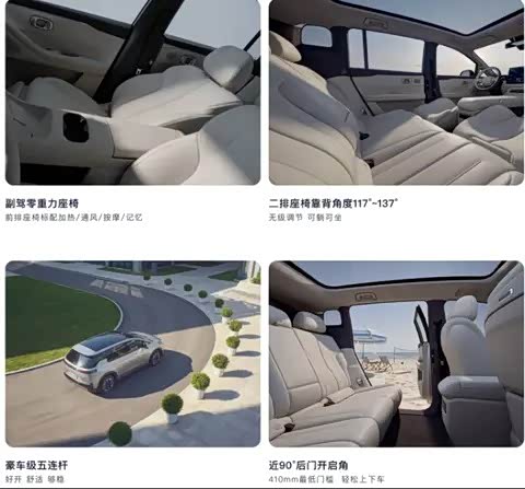 舒适配置方面,新车全系标配副驾零重力座椅,前排座椅支持加热、通风、按摩、记忆四大功能,2.38㎡全景天幕搭配电动遮阳帘,大幅提升车内通透感;后五连杆独立悬架经过专属调校,滤震效果出色,后排座椅靠背可实现 117°-137° 无极调节,配合 35 处多元化储物空间与可扩展后备厢,完美适配家庭出行与户外郊游场景。