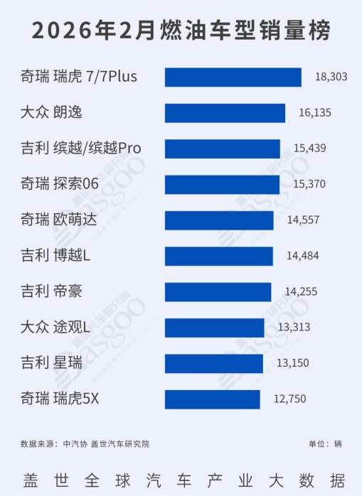 在新能源持续渗透背景下,2026年2月燃油车市场未现衰退,反而依靠稳定需求、完善产品矩阵和技术升级,展现出较强韧性。数据显示,2月燃油车榜单前列车型销量均在1.2万—1.8万辆之间,自主阵营的强势表现与合资品牌的稳固基础,共同构成燃油车市场的格局。