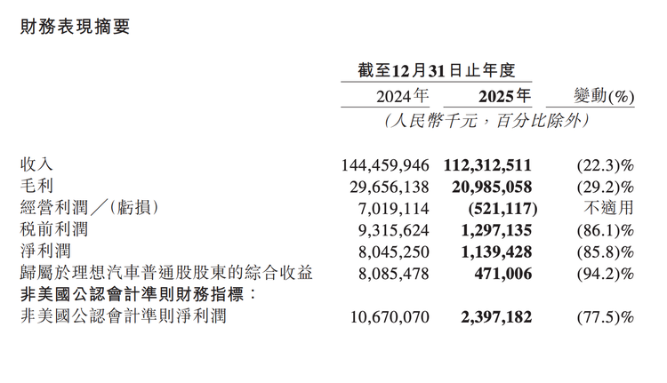 理想不仅全年营收同比下滑22.3%;车辆毛利率从19.8%降到17.9%;经营利润率也从4.9%掉到-0.5%;同时经营现金流从2024年的净流入159亿元转成2025年的净流出86亿元,自由现金流也从正82亿元转为负128亿元。