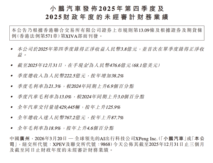 先看最后一个发财报的小鹏。财报显示,小鹏2025年全年交付42.94万辆、营收767.2亿元,Q4首次单季净利润转正至3.8亿元。