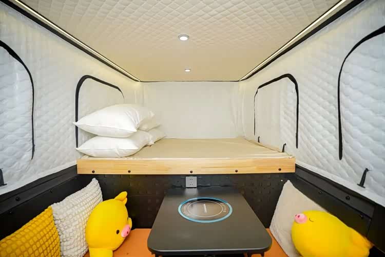 “够舒适”,真正做到走到哪,睡到哪。长安猎手飞猪版车型在硬核越野基础上,创新融合了背驼房车形态,采用航空级全铝房箱,房箱不升起时,车高2.2米,可自由出入地库,能日常通勤代步,房箱升起时,就是户外“自由的家”。配备2000*1700mm折叠式额头床、折叠餐桌及卡座组合床,空间灵活百变;定制户外专用篷布,帐篷采光软帘,100L定制清水箱、室内淋浴套装等,带来豪华舒适的新享受。