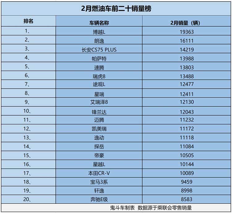 日前,乘联会发布2月车市零售销量数据,鬼哥整理出2月燃油车销量排名前二十榜单,结果发现,榜单上,共有17款燃油车2月份销量突破万辆,接下来,看看具体销量表现与集体排名。