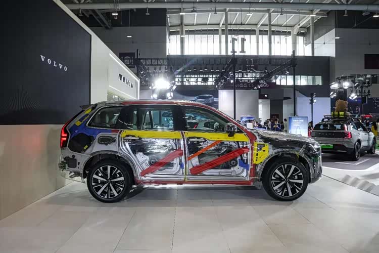 通过将白车身进行分色涂装的处理,消费者有机会直观了解沃尔沃XC90的用料和安全设计理念。以白车身的用料和结构为例,透明车展示的绿色部分为铝合金,而暖色系部分则为高强度钢,其中红色部分为强度1500兆帕的硼钢材质,沃尔沃通过6横6纵的笼式车身保障在碰撞事故中,乘员的生存空间完好。