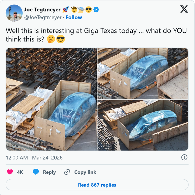 ▲当地时间3月24日,Teslarati披露特斯拉得州工厂现神秘测试车事件